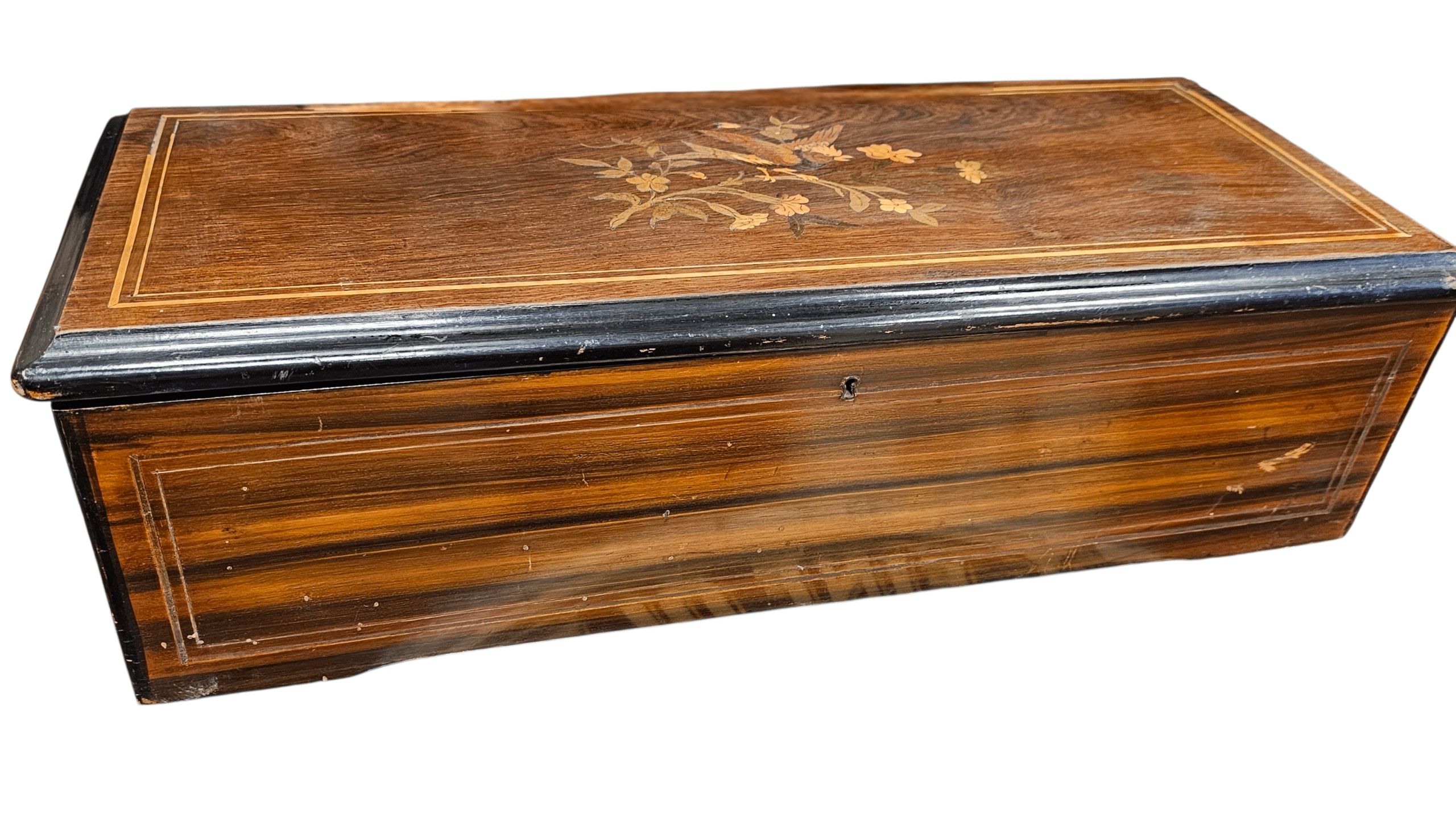 Cylinder and comb mechanism housed within a wooden casing, featuring a glass lid to protect the delicate internals.