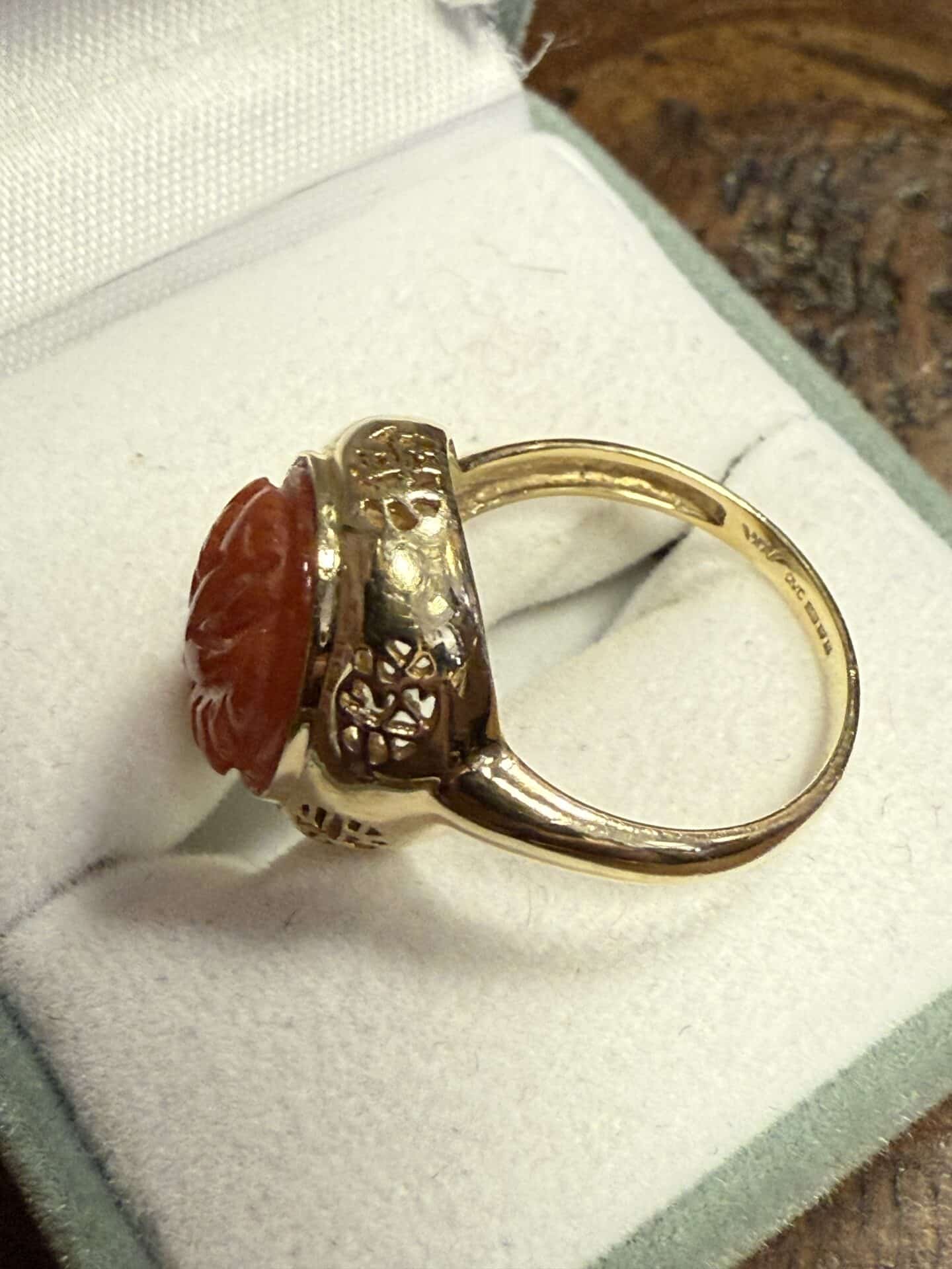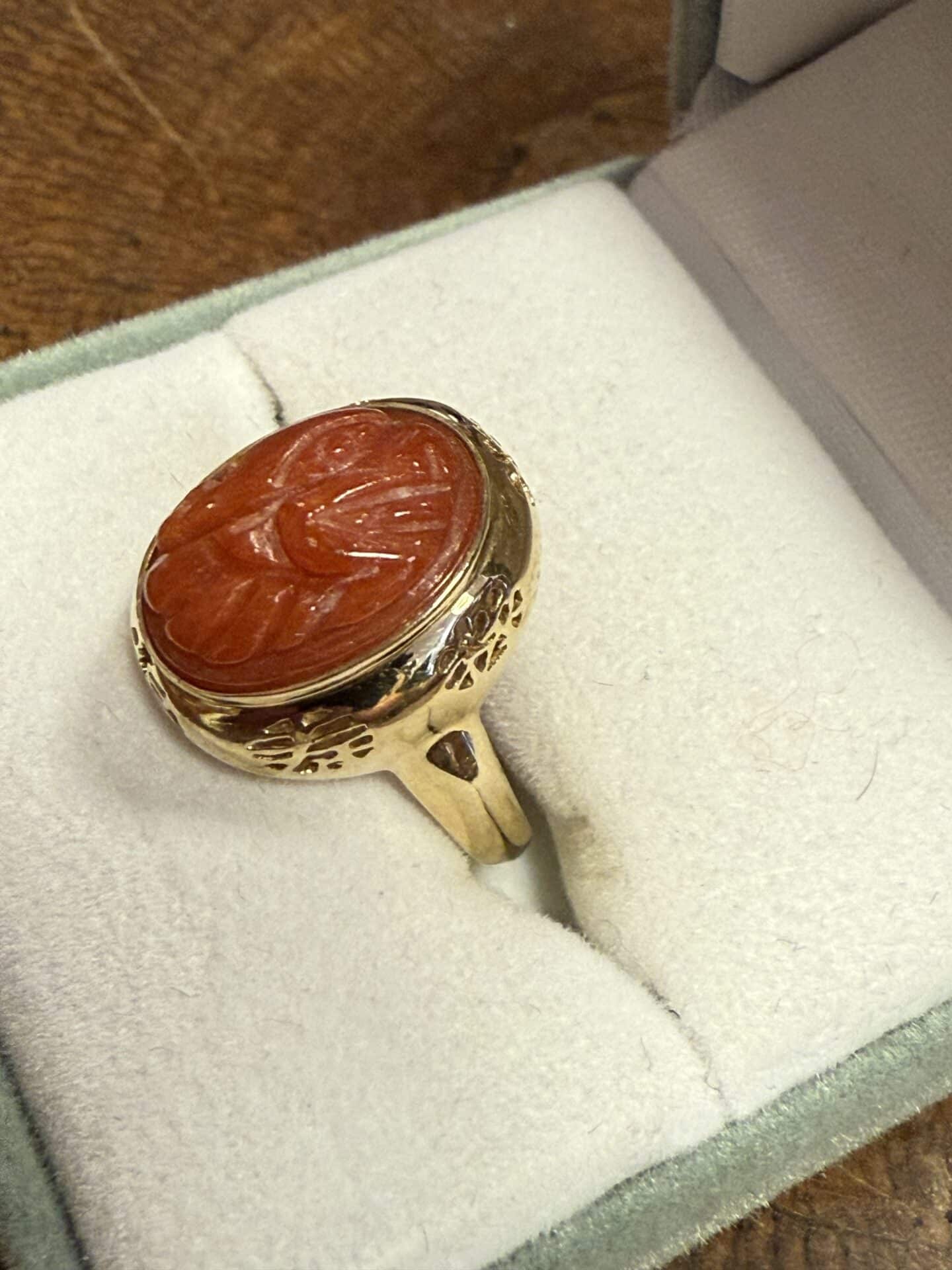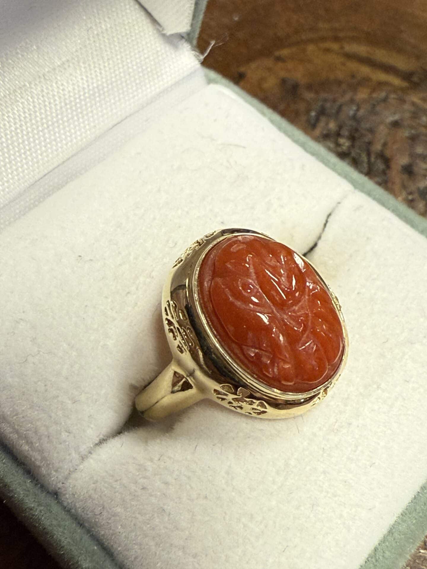 Carnelian Agate Carved and Polished Oval Cut Gemstone Mounted on 14 Carat Yellow Gold Band Ring Size UK  O+