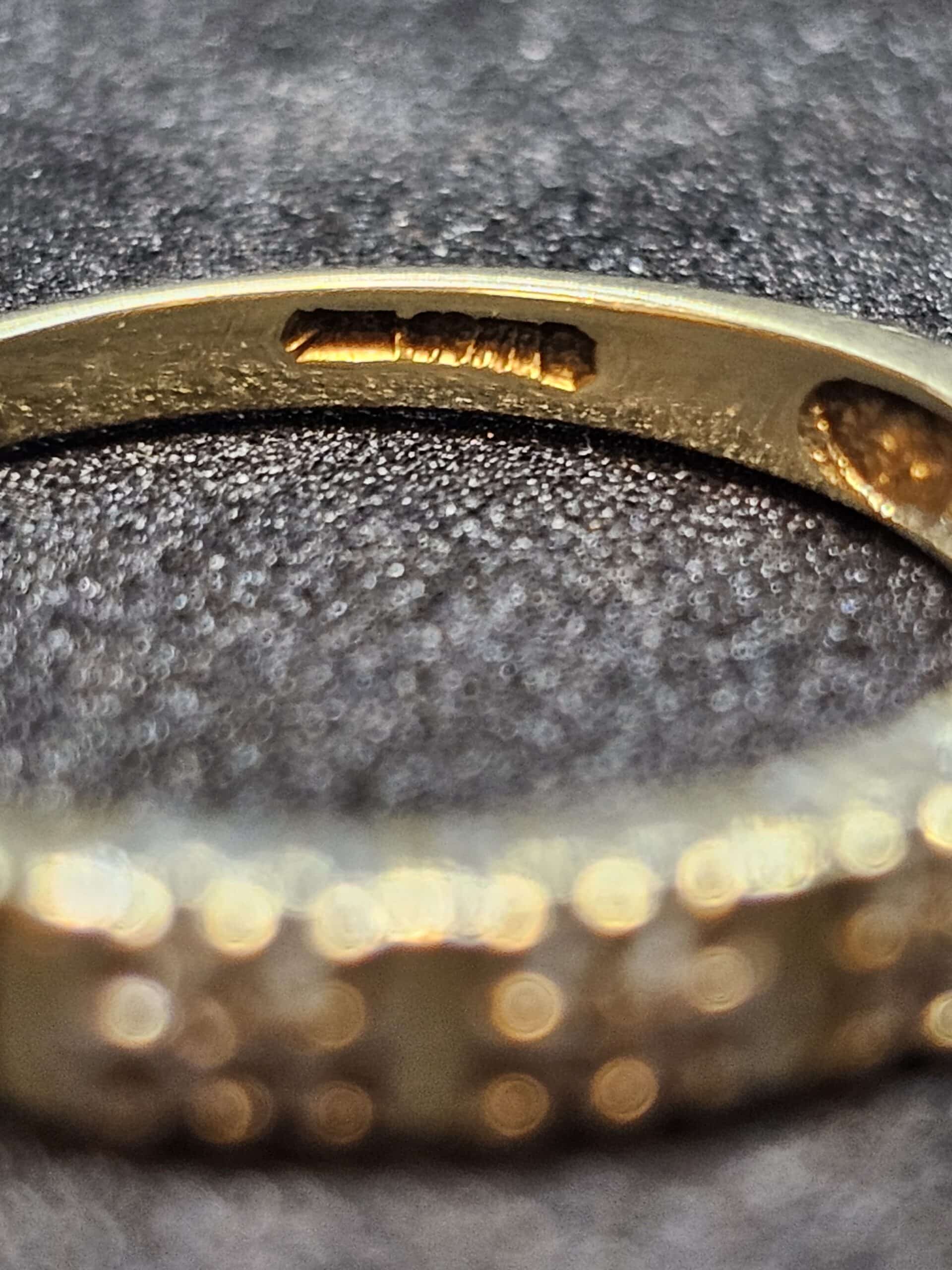9ct gold half eternity ring featuring a “Tetris-like” pattern with bands and brilliant cut diamonds