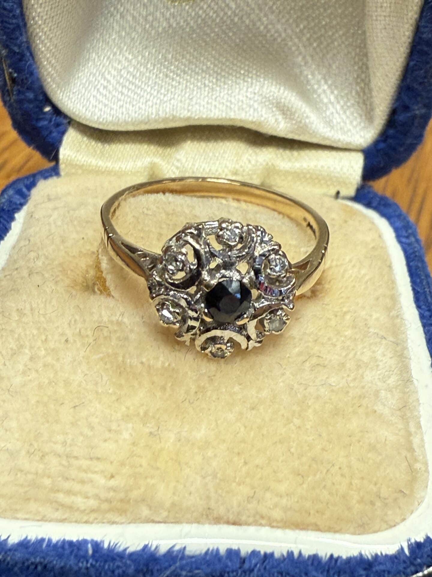 Beautiful 9ct gold ladies ring set with a central sapphire and surrounded by illusion set diamonds