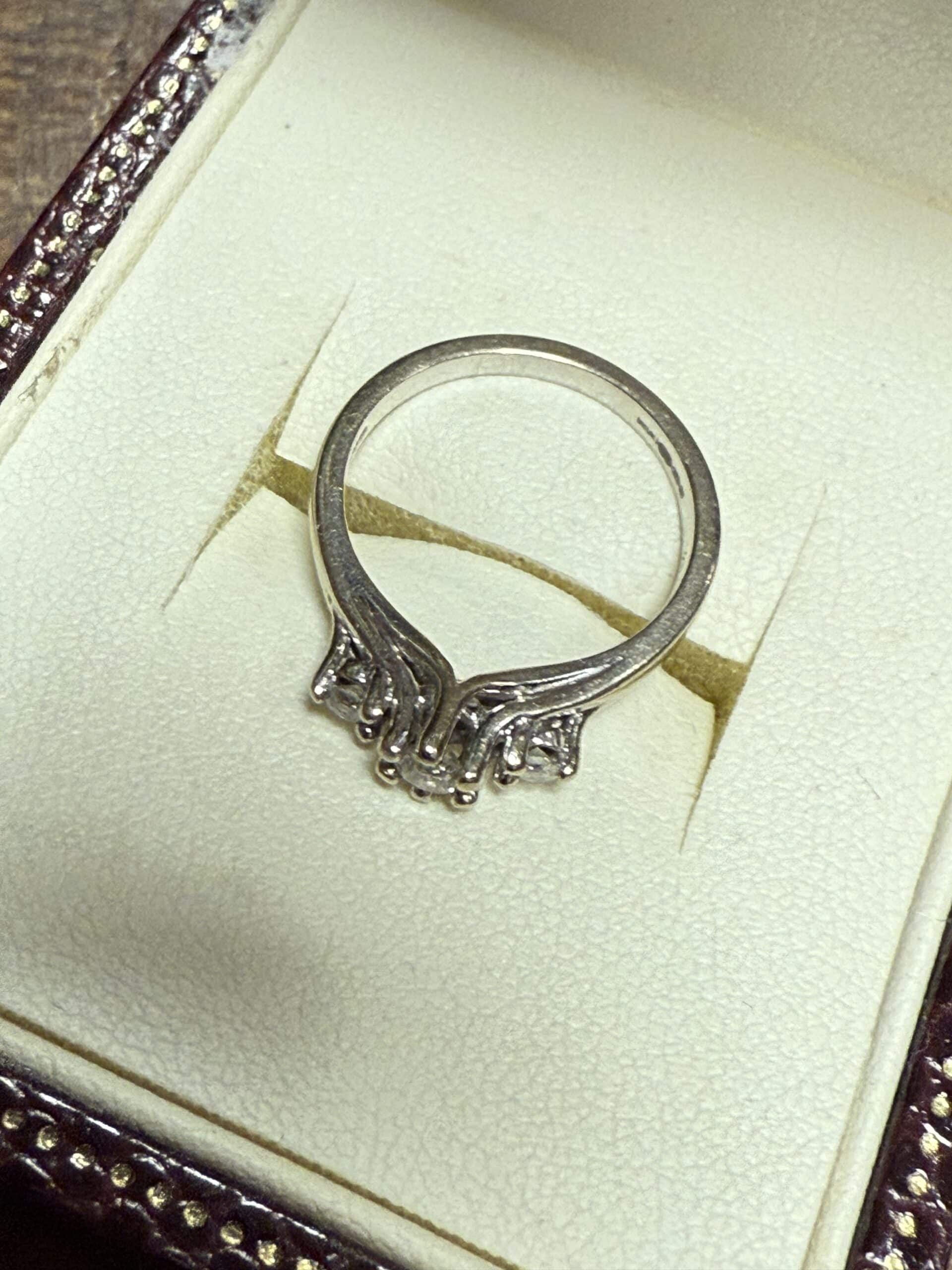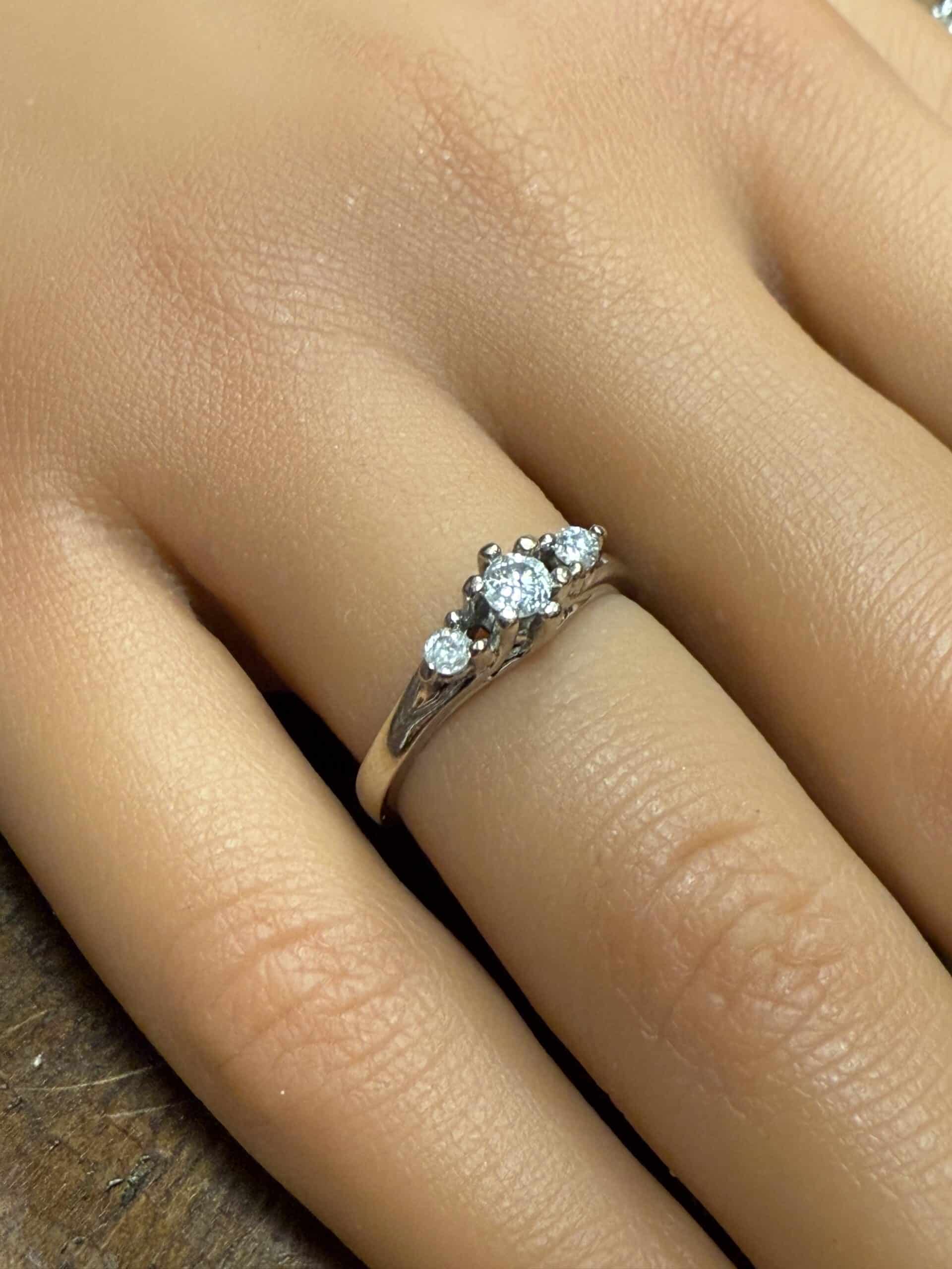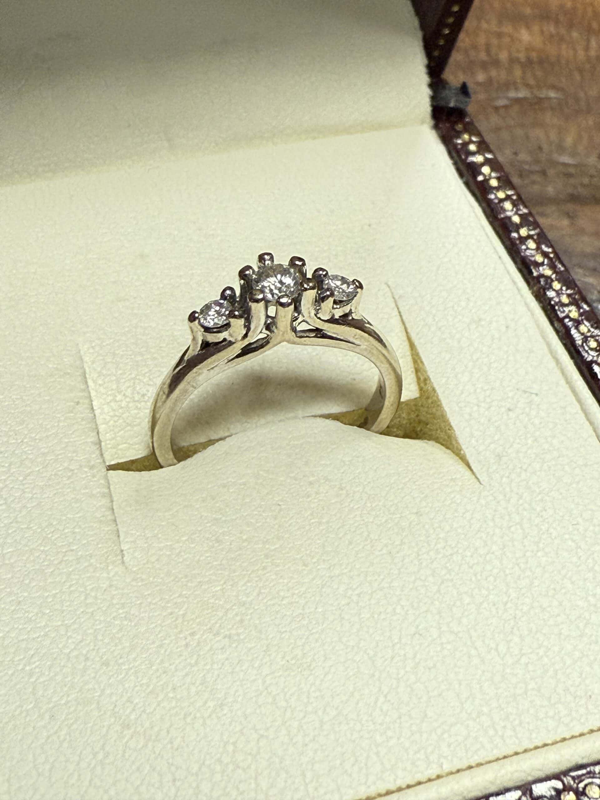 Beautiful three stone ladies diamond ring in 9ct white gold in good preloved condition