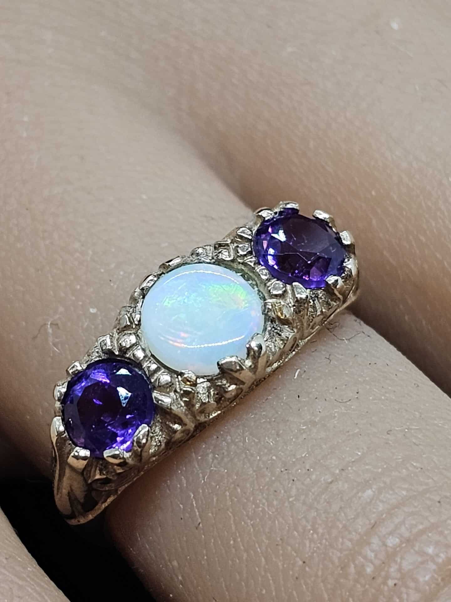 Lovely vintage Amethyst and Opal trilogy gold ring