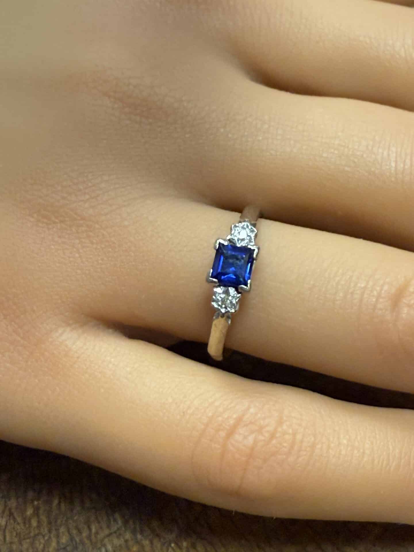 Art deco ladies Ceylon sapphire and diamond 18ct gold ring in excellent preloved condition