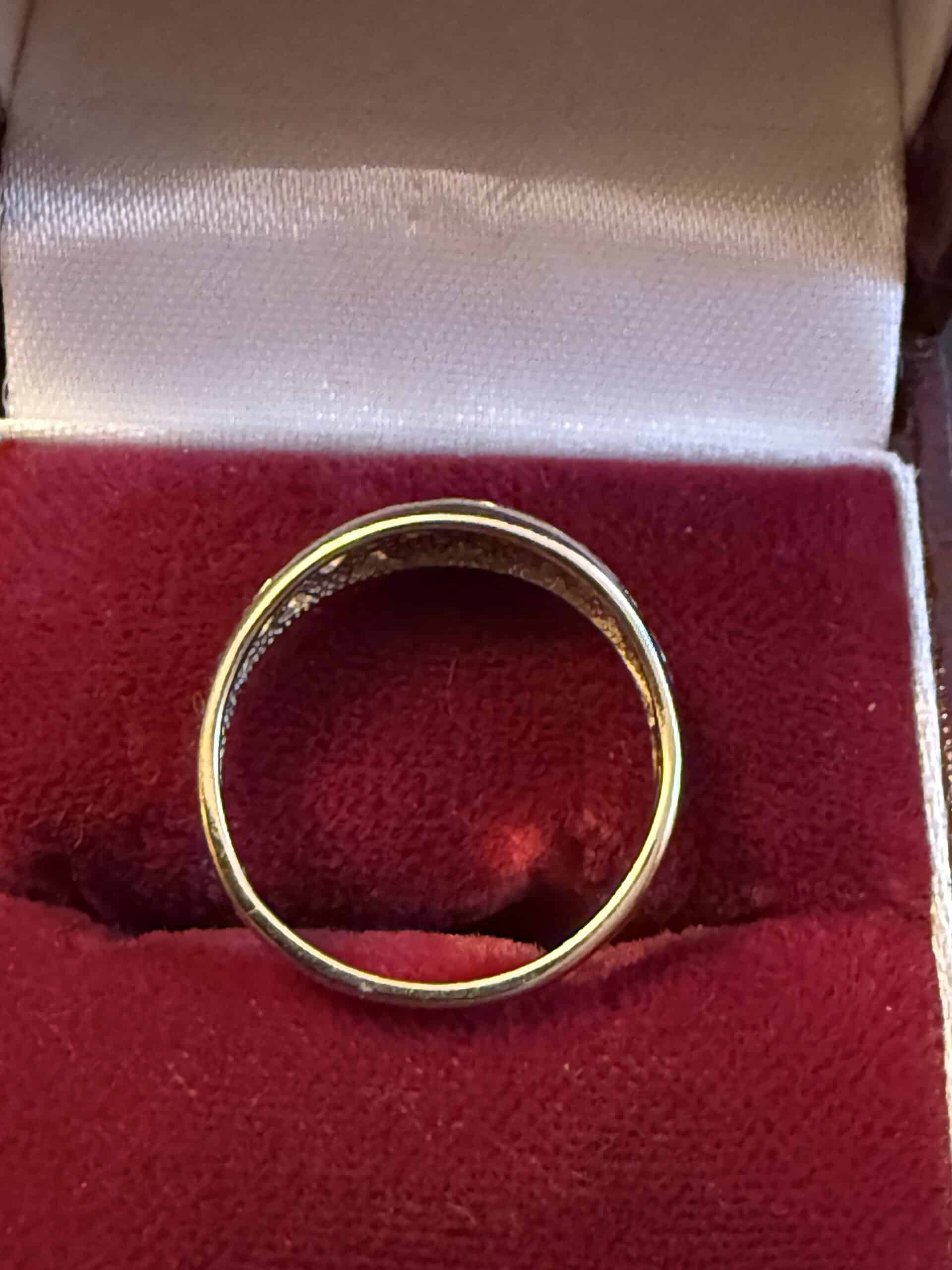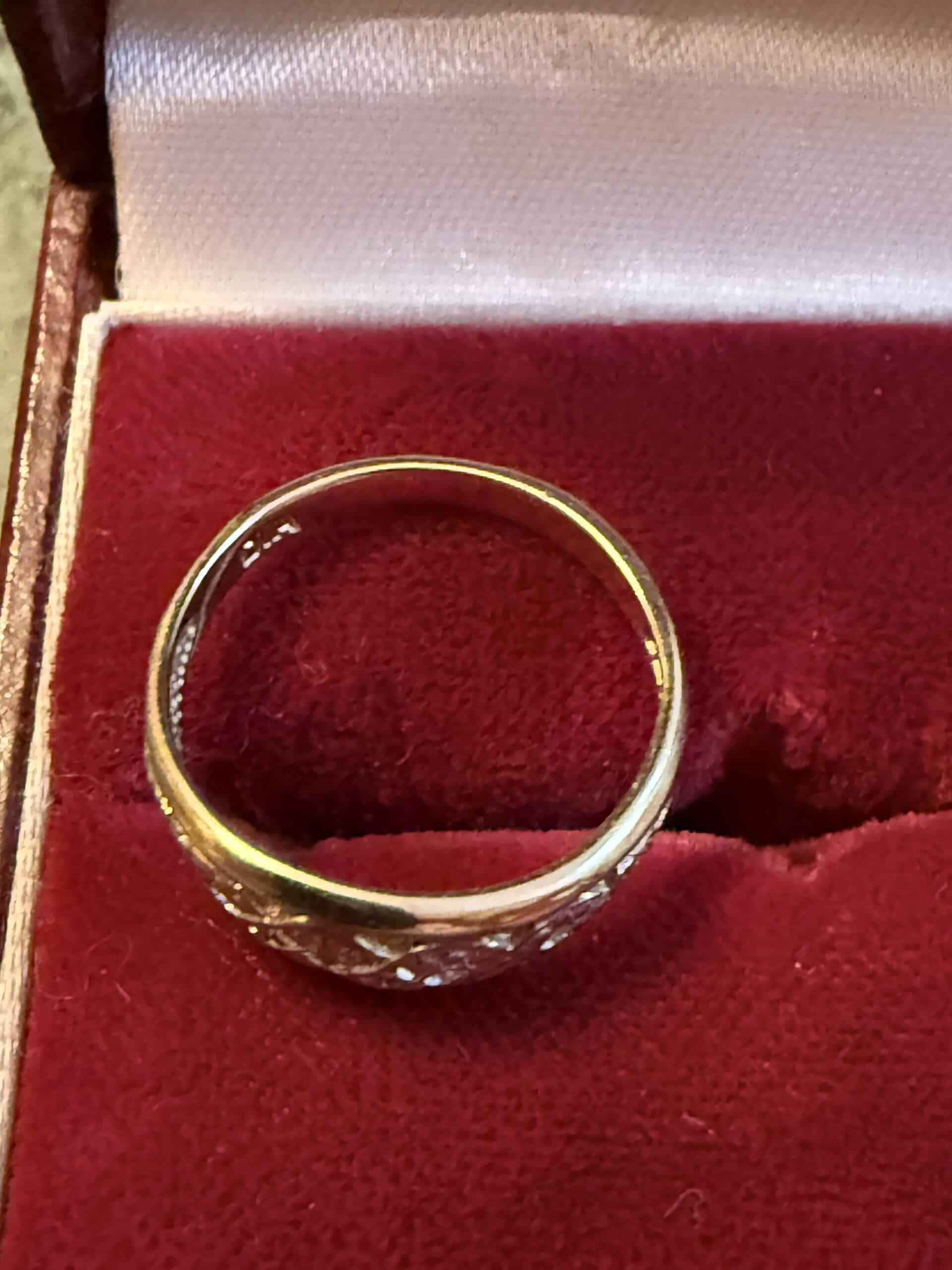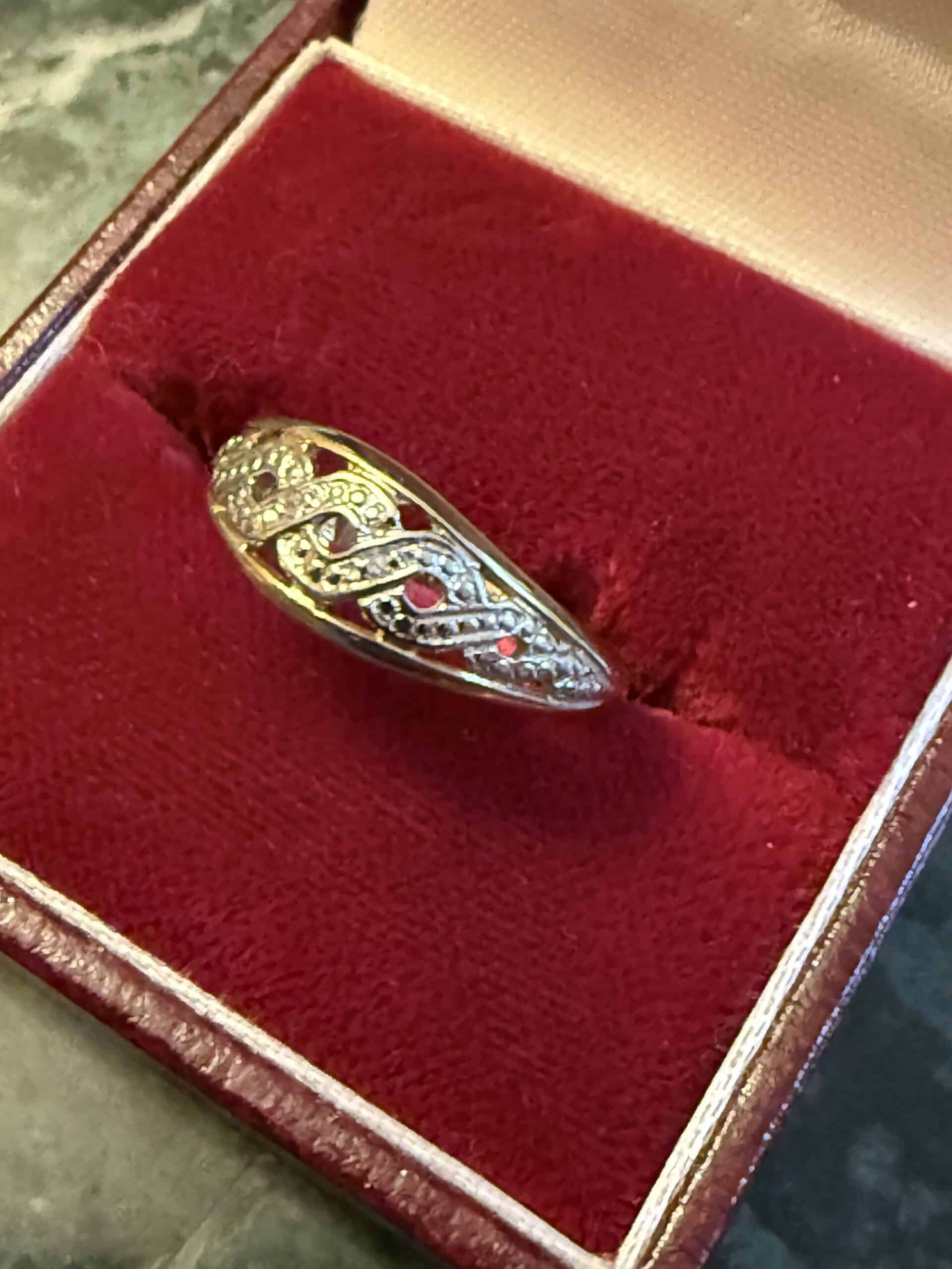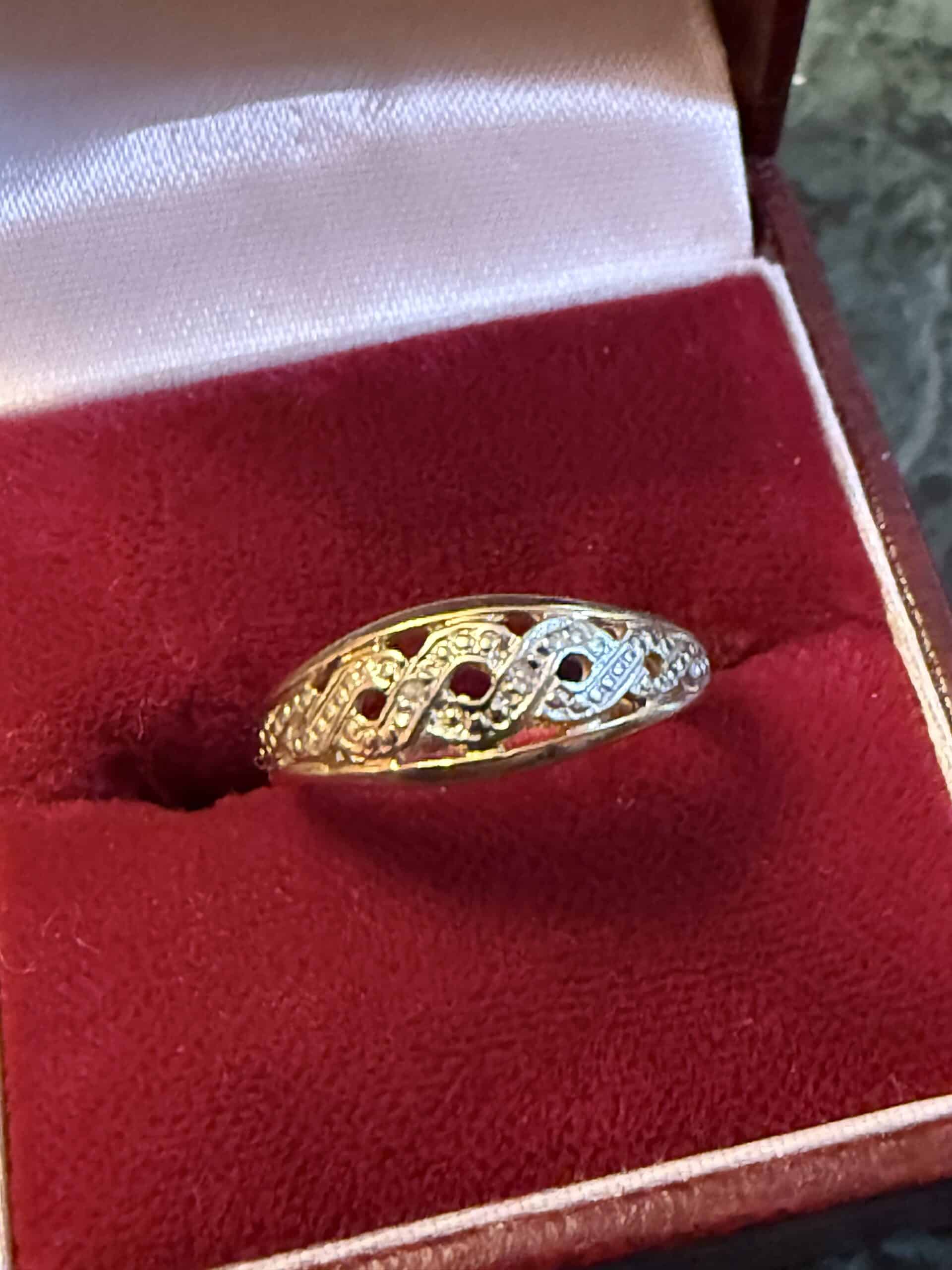 Very nice Celtic styled ladies 9ct gold ring with a central twist set knotted band of white gold set with wee diamonds