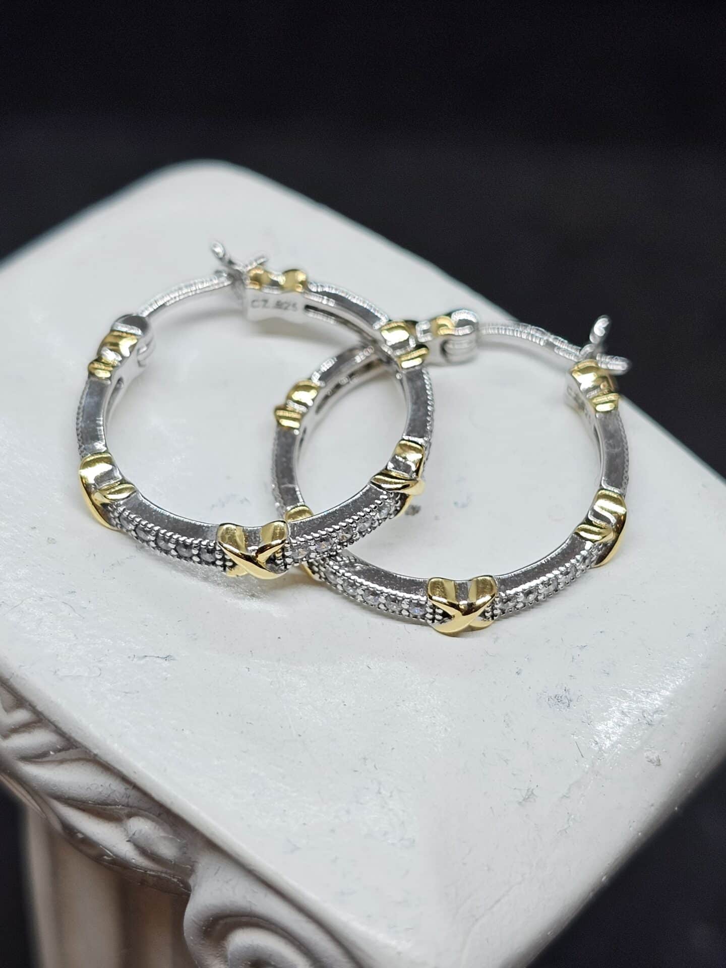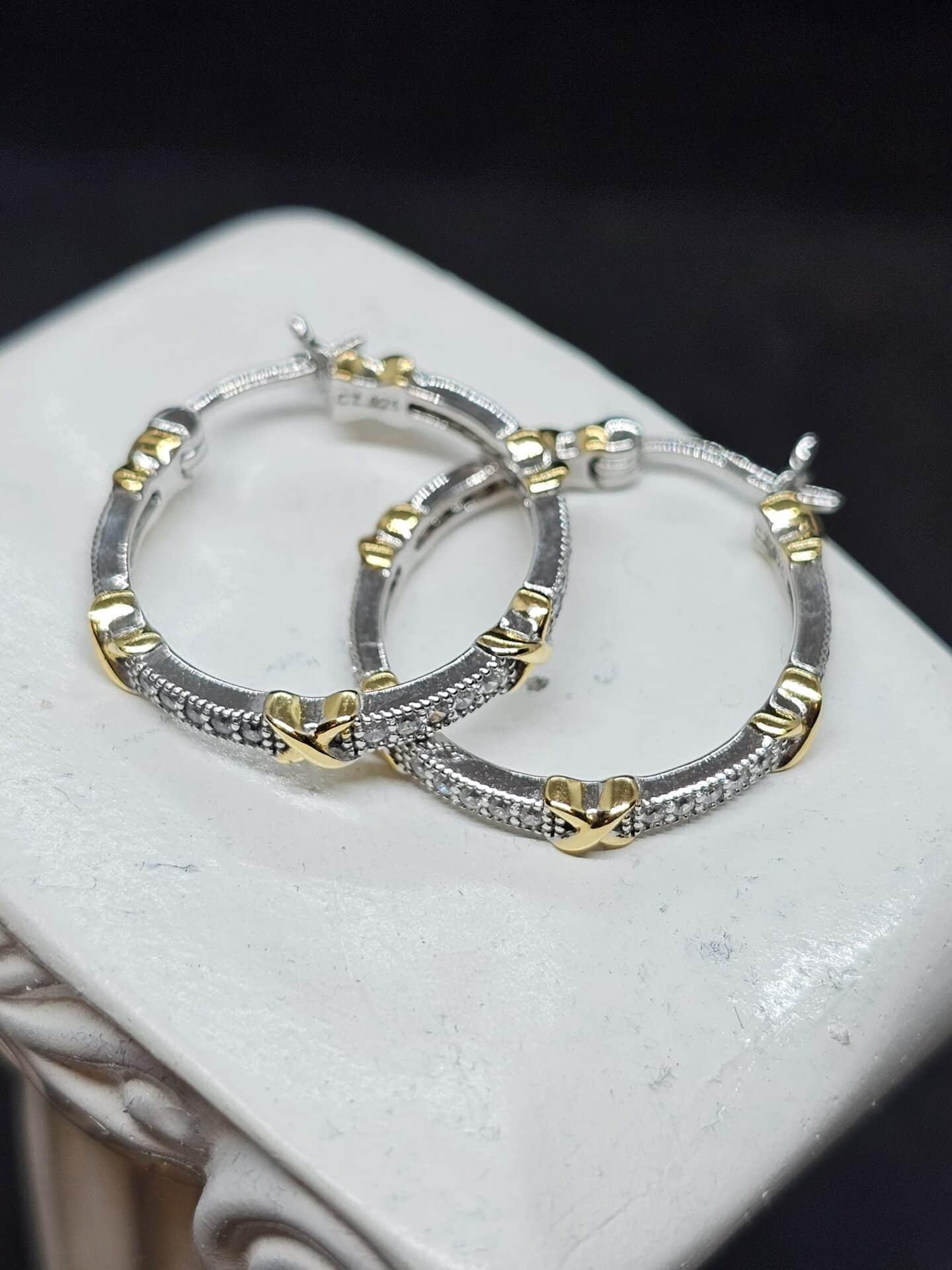 Silver hoop earrings with accent gold crosses and set with cubic zirconia