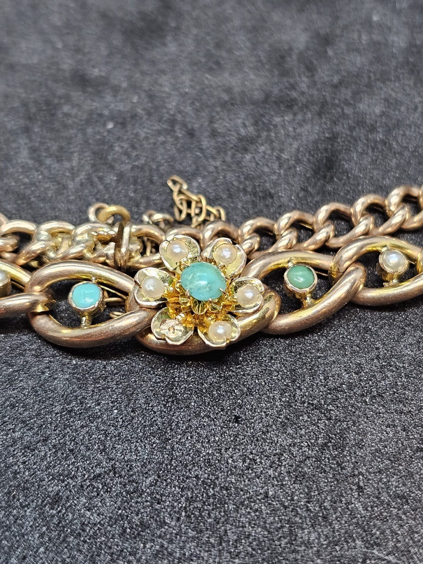 Gold Bracelet with Turquoise and Pearl floral design