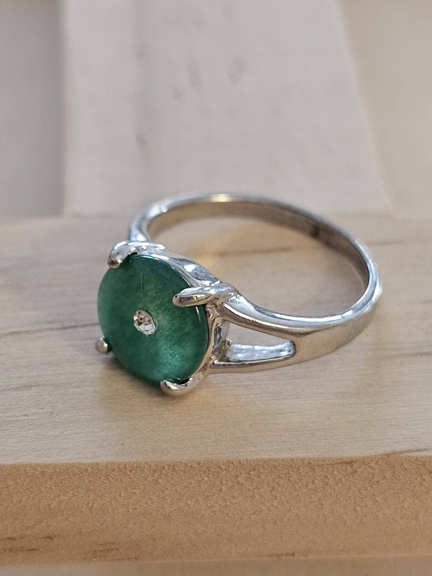 Jade solitaire ring with central clear stone set on white metal