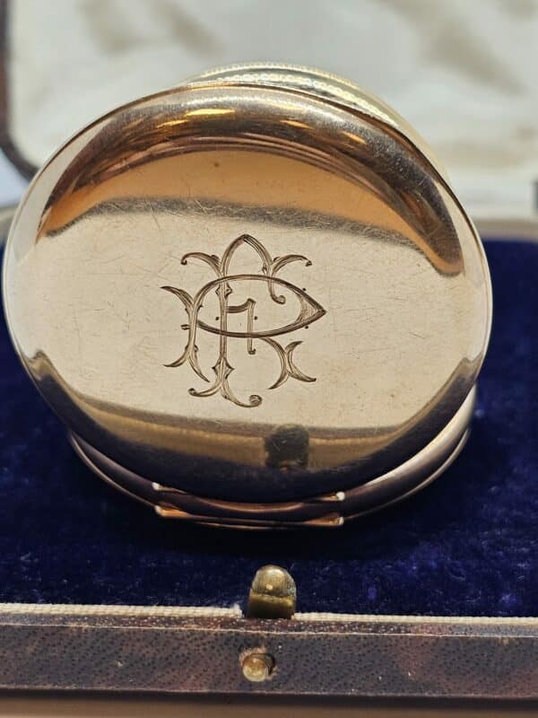 Case – the movement comes in a solid 9K gold half hunter case, which has a hinged inner, back and front cover. The front cover pops open crisply to 90 degrees when you press the winder in. The case has dark blue enamel numbers and the rest of the case has a smooth plain finish.