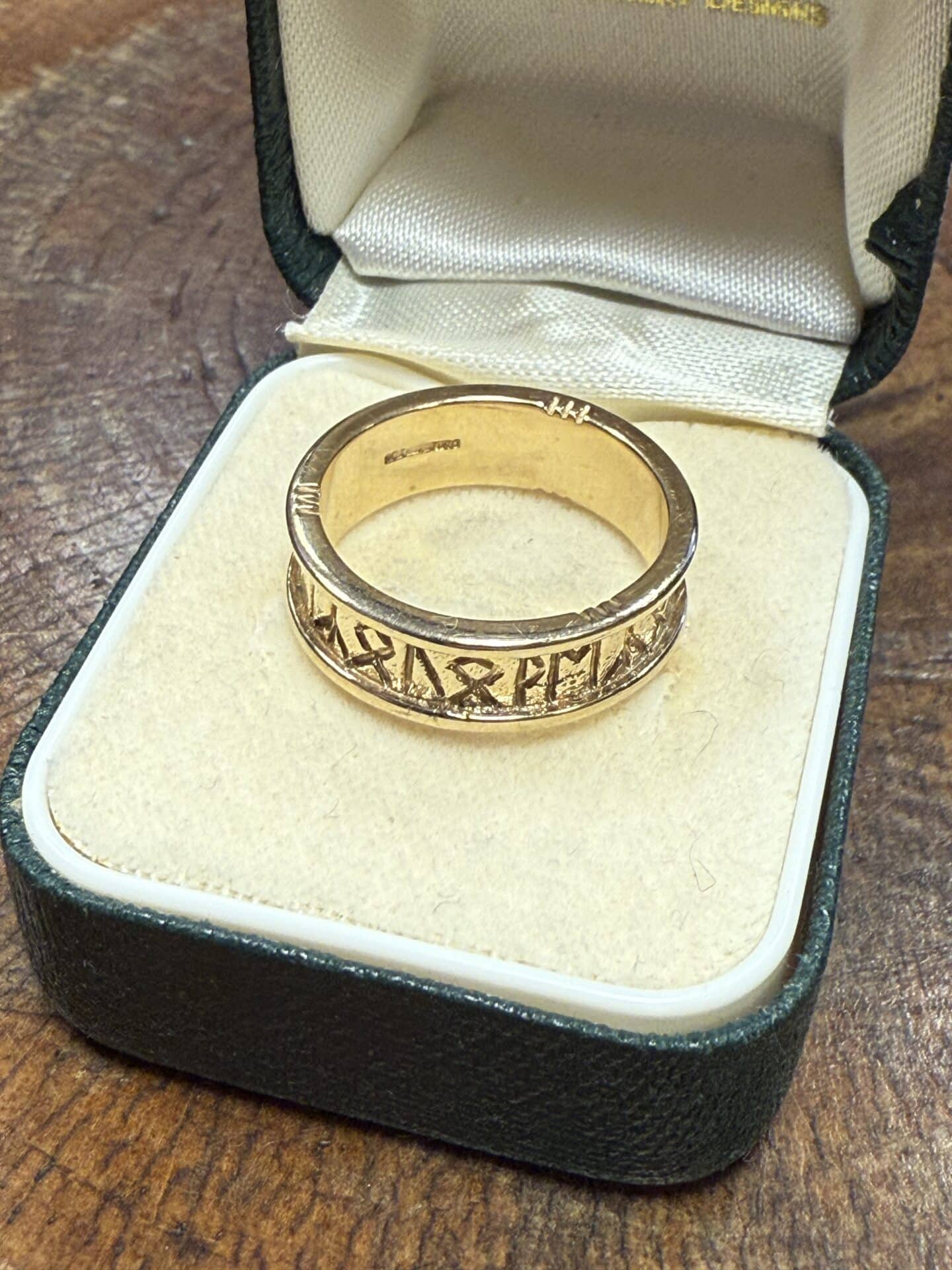 The Norse people of a thousand years ago recorded their thoughts, poetry, and vows of love in the twig-like runic alphabet. Carved on wood, bone and stone, their voices speak through the ages.  Ola’s design spells ‘I love you,’ more romantic than your average Viking carving!