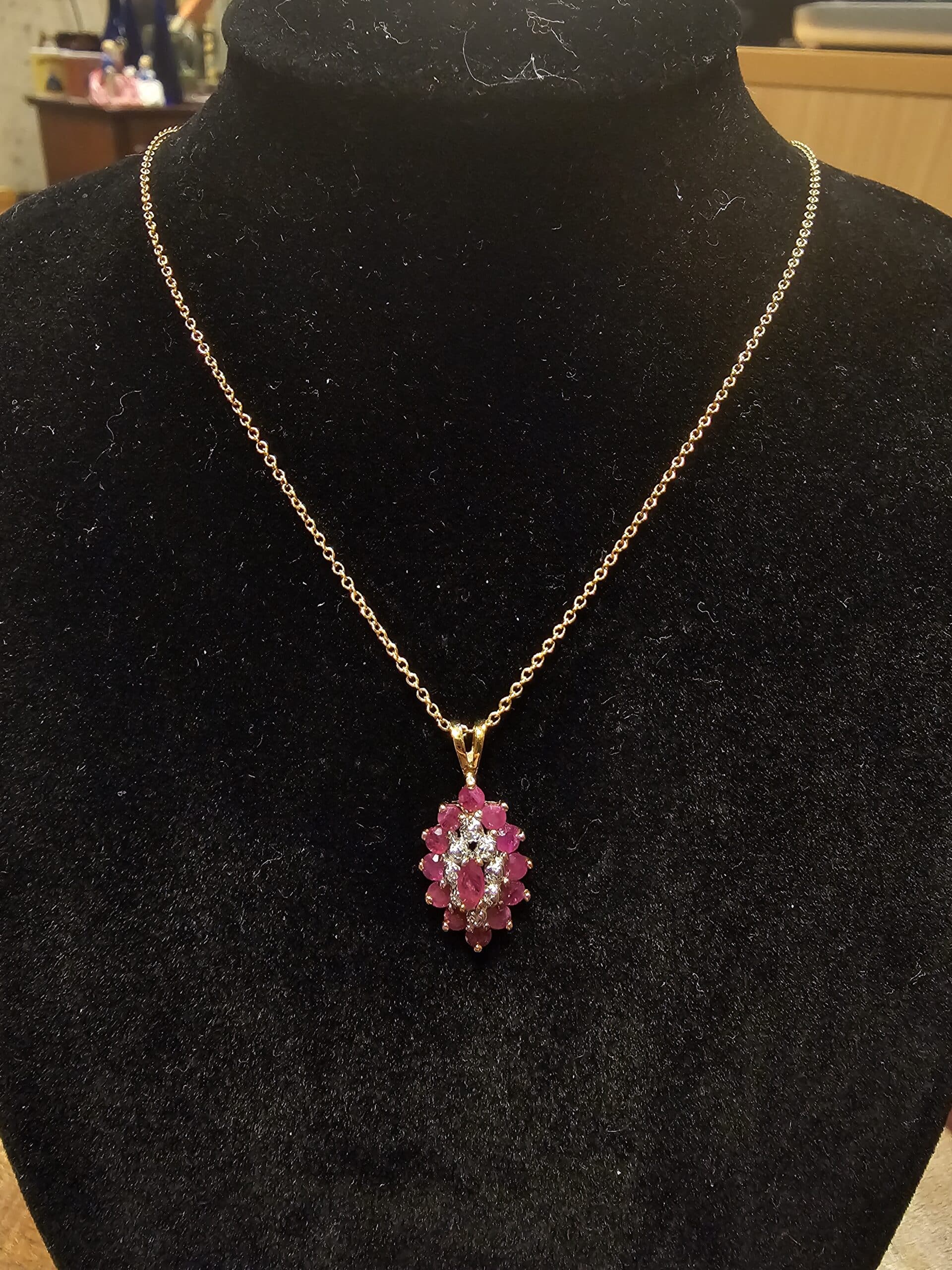 Ruby and Diamond Necklace in Yellow 9ct Gold. The necklace features a lovely vivid red natural ruby marquise center stone surrounded by a halo of round diamonds. Surrounding the diamonds is an additional halo of round brilliant cut natural rubies of vivid colour.