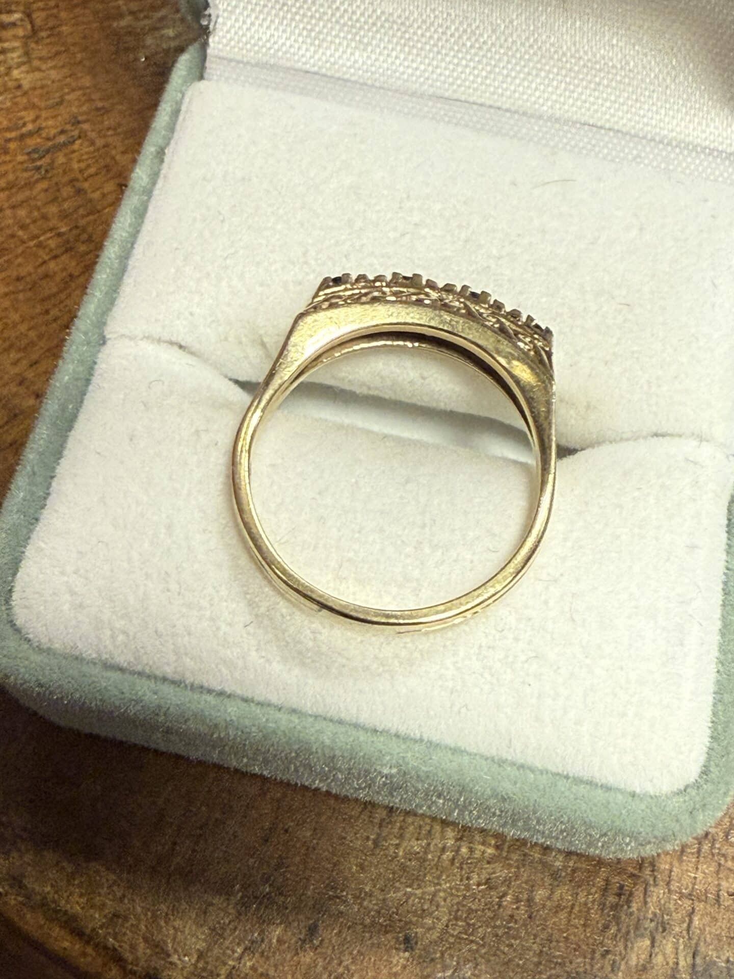 this unusual setting is slightly castleated in style and although the stones are small it’s a very stylish ring