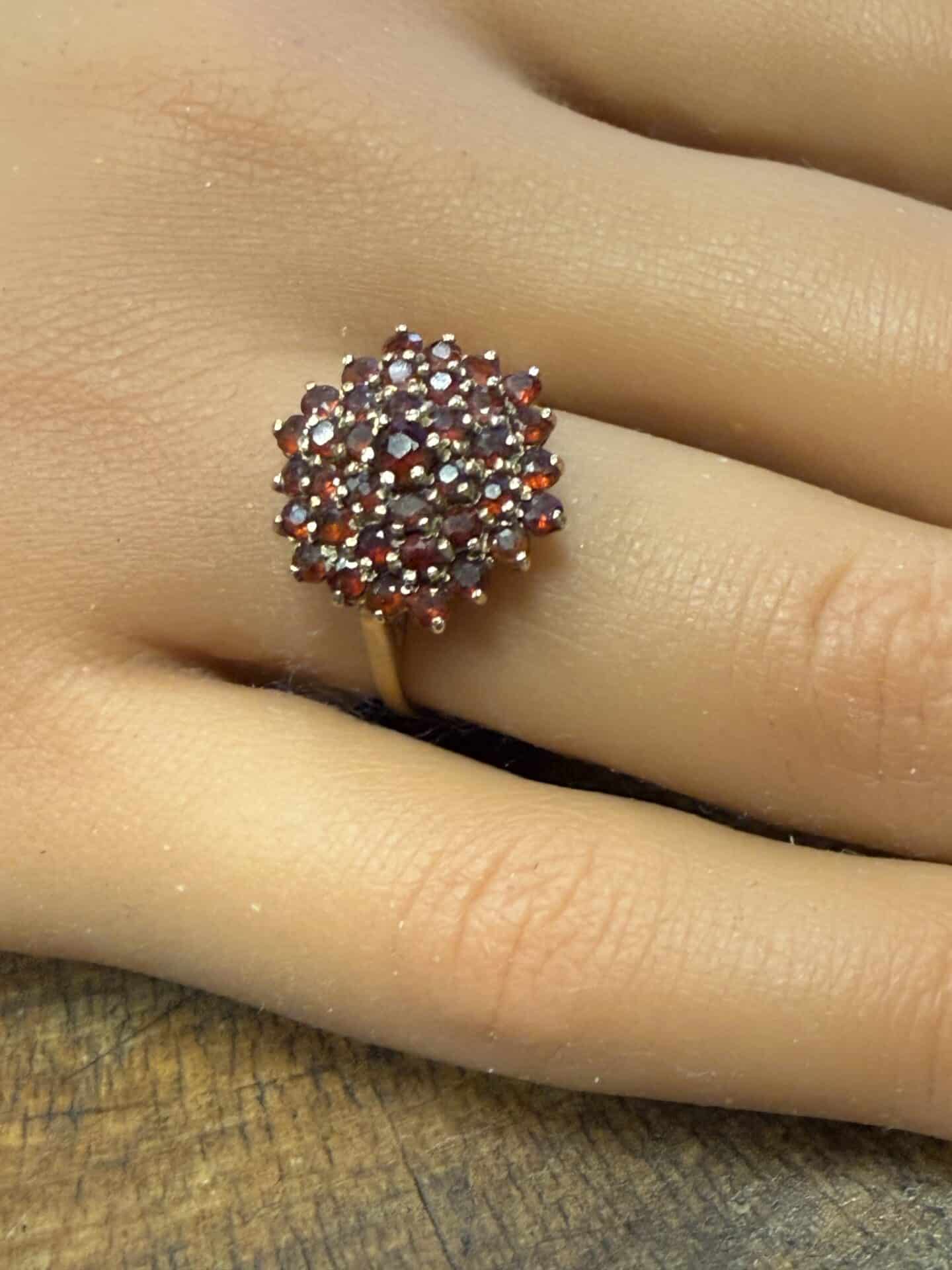 this vintage 9ct gold and garnet cluster is a thro to the 70s