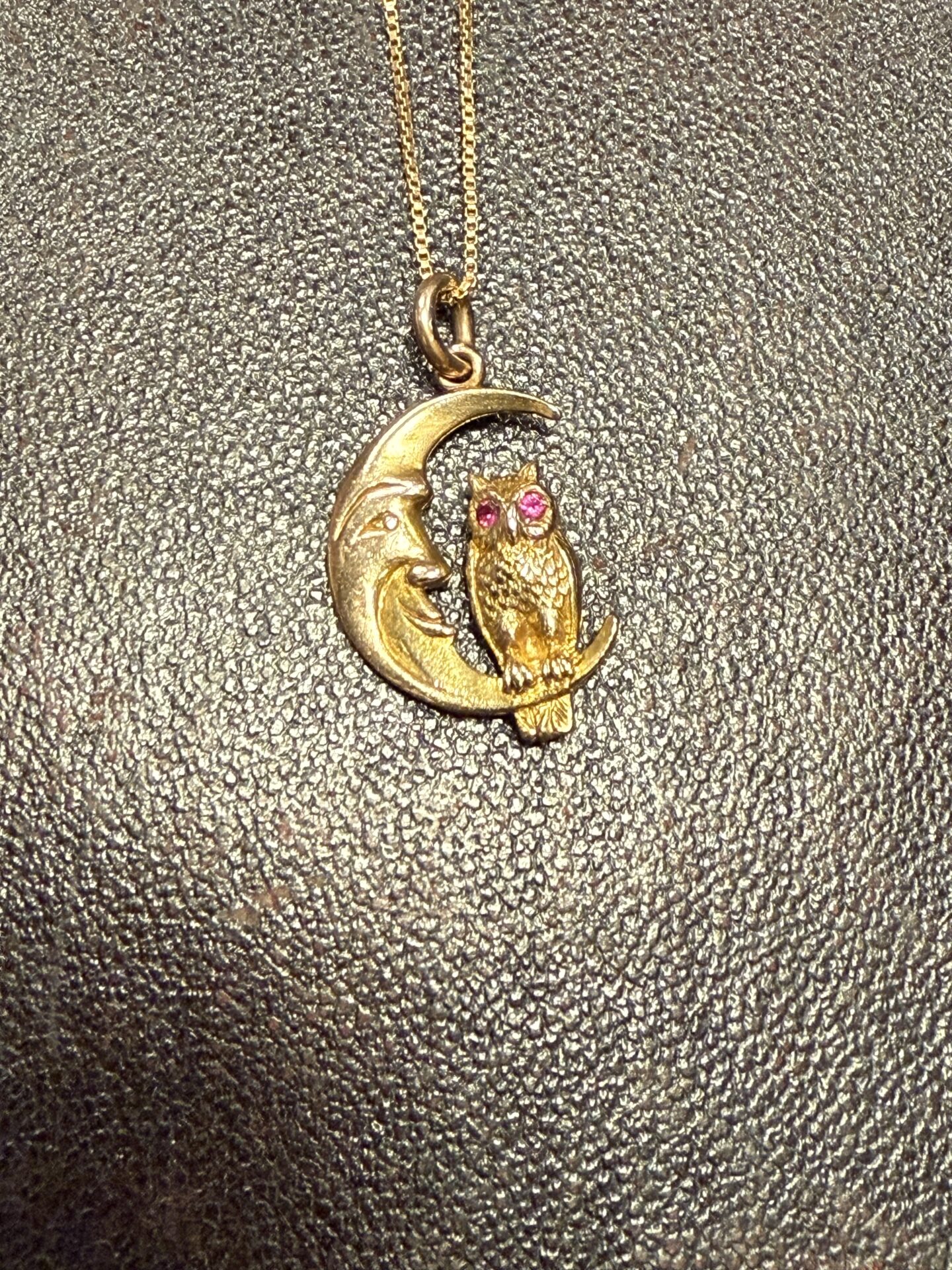 Vintage owl on moon pendant with ruby eyes 9ct gold
