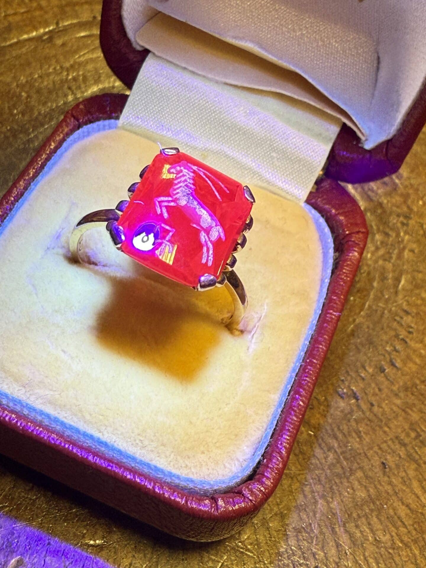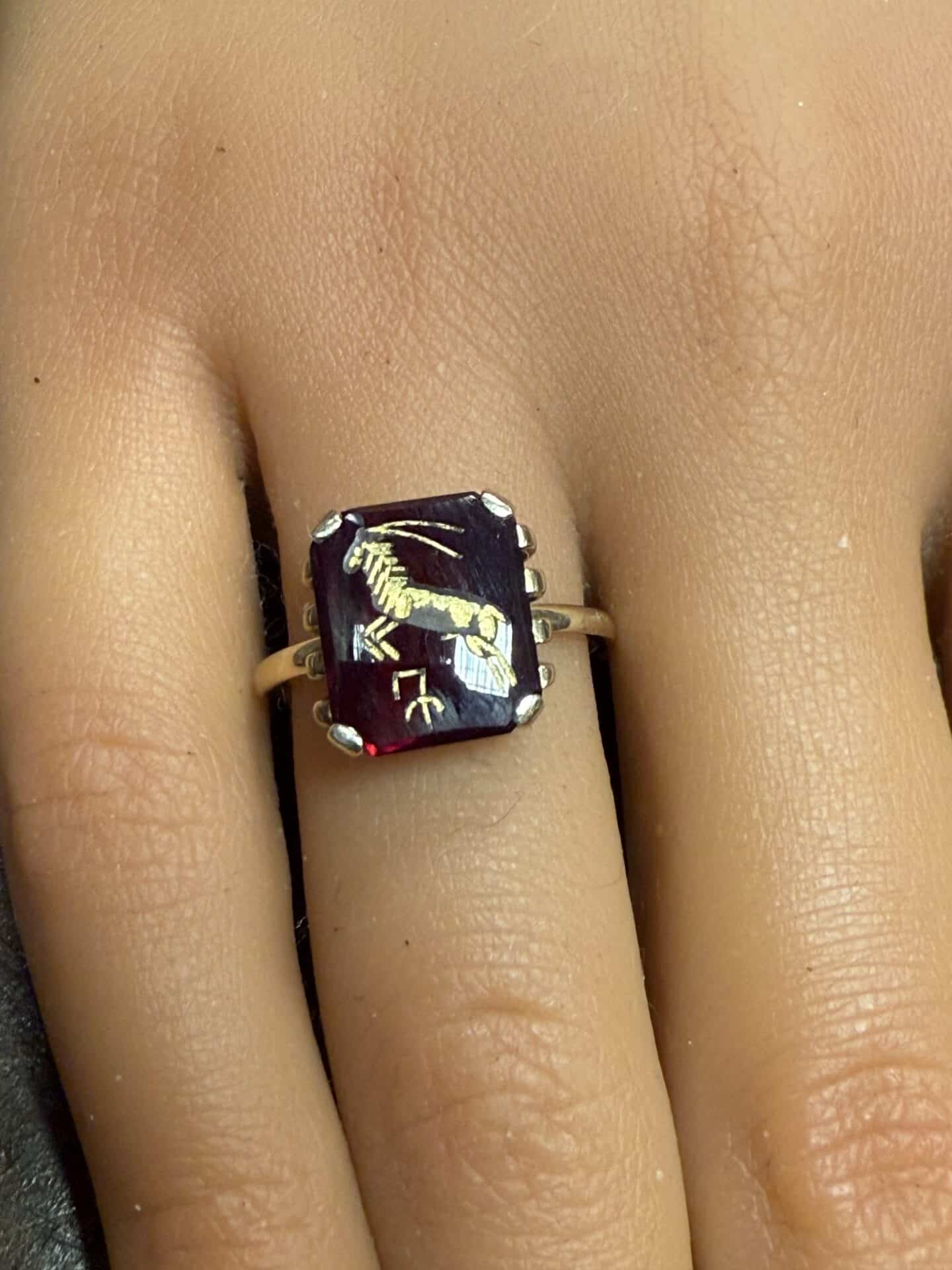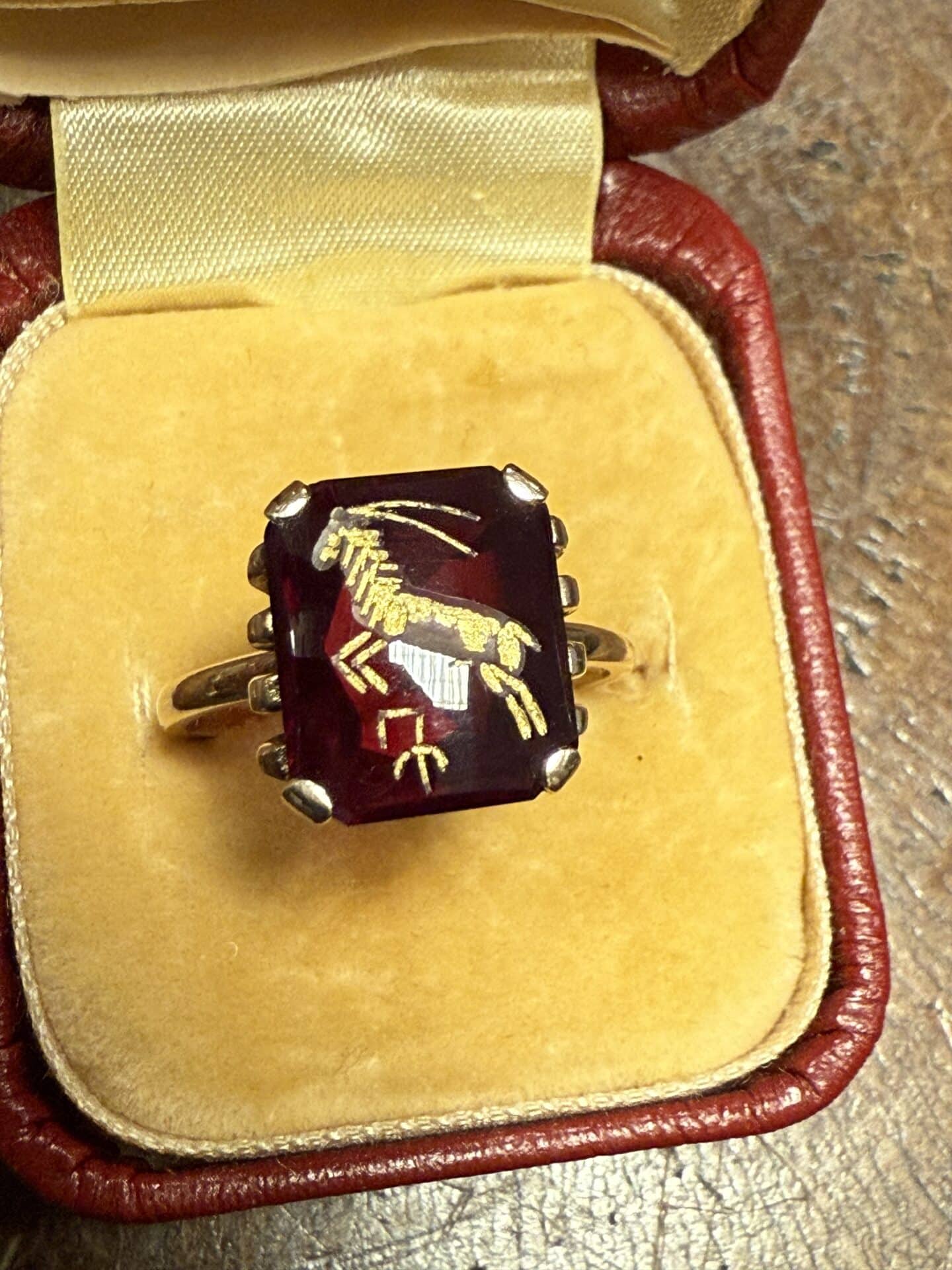 lovely vintage 1957 hallmarked spinel ring engraved with the sign for Capricorn in excellent preloved condition