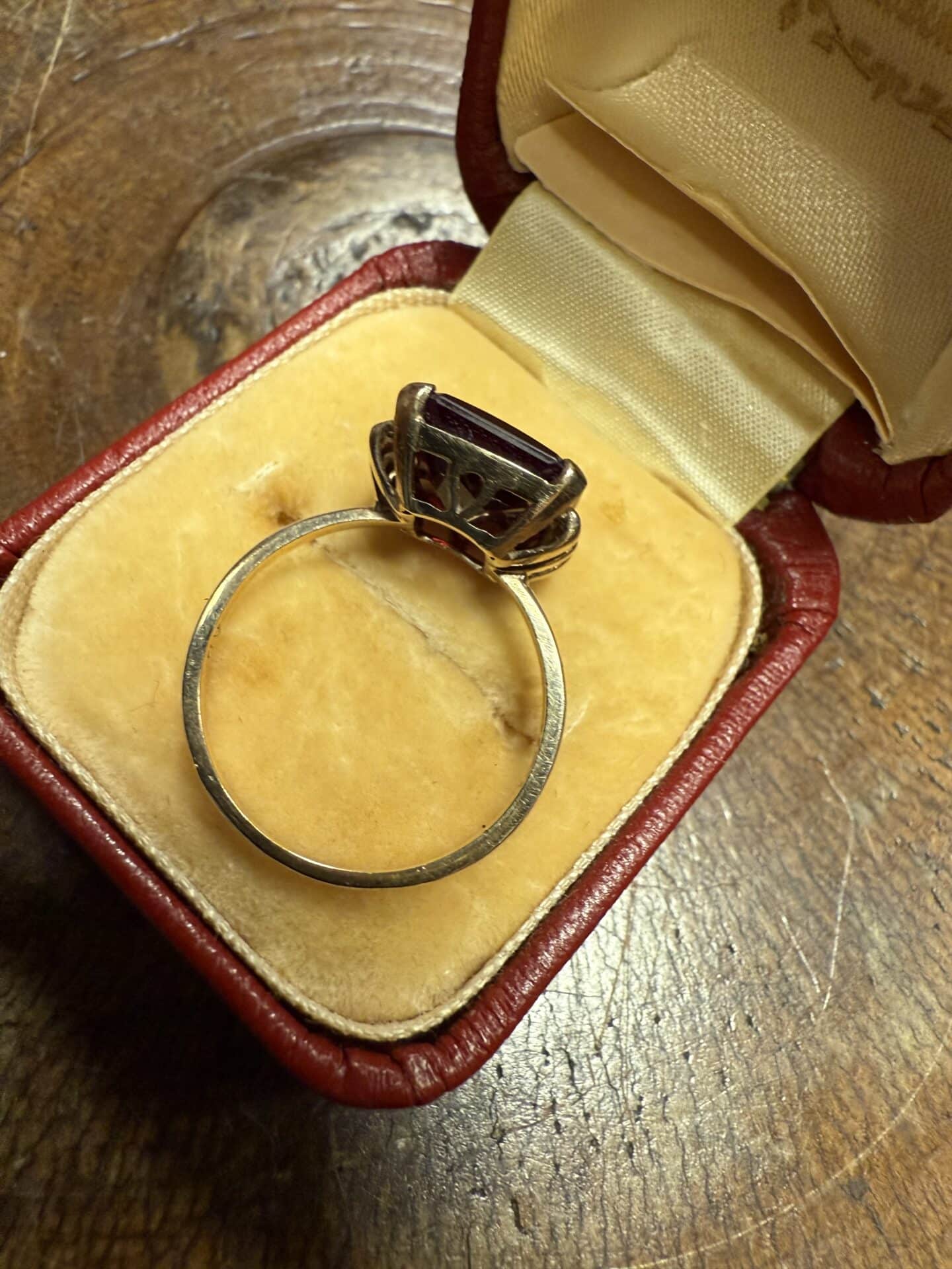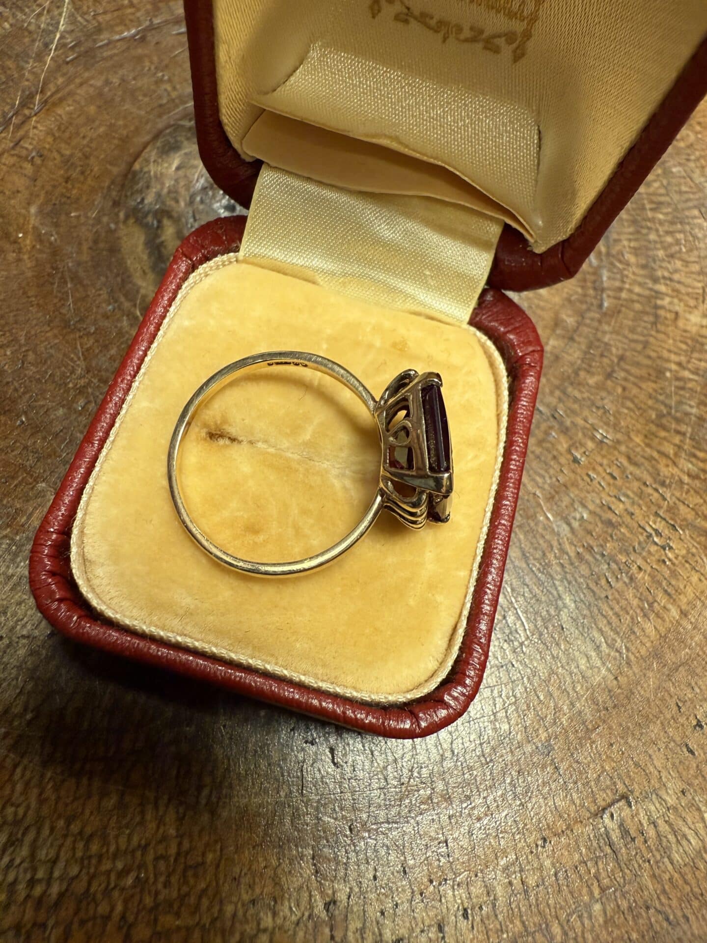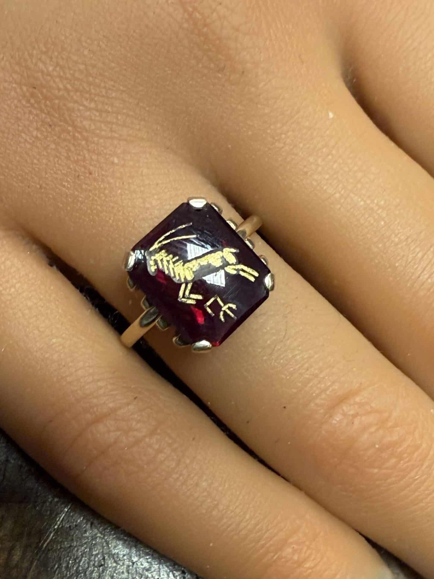 lovely vintage 1957 hallmarked spinel ring engraved with the sign for Capricorn in excellent preloved condition